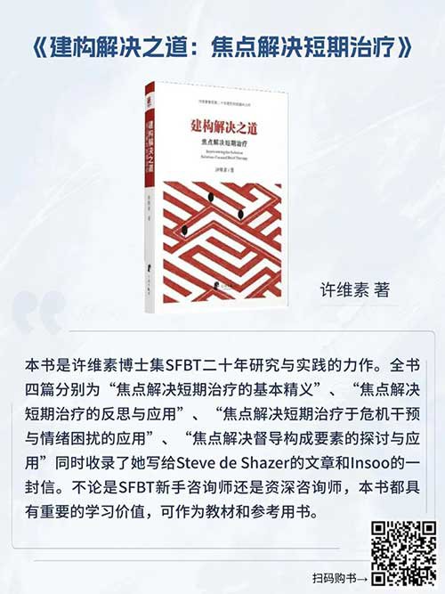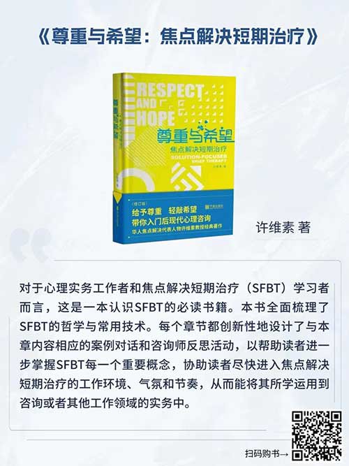 为了帮助SFBT咨询师掌握理论知识、提升实务能力,从而更好地服务于社会大众。漫语心理向您推荐阅读许维素老师所撰写的《尊重与希望:焦点解决短期治疗》和《建构解决之道:焦点解决短期治疗》。