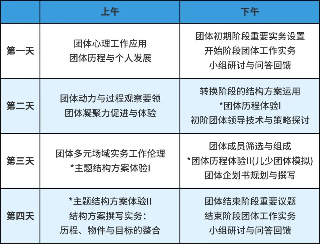 本课程采用多元化的授课方式,涵盖实务理论讲授、体验性活动、团体方案示范与演练、团体过程与咨询体验,以及深度实务研讨与分享等多个环节。特别在课程的第二、三阶段,强化了实作能力的培养,并融入了实务实习与督导方式,旨在全方位深化受训者的实务能力。