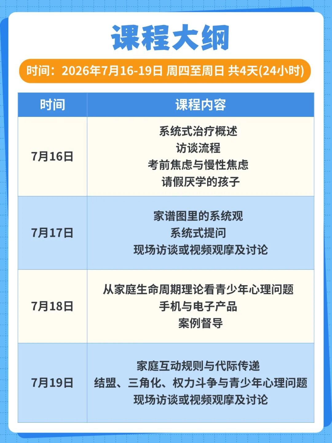 课程采用 “理论精讲 + 技术解析 + 家庭访谈 + 案例督导” 等多元教学方式,讲解实用技术,通过示范与练习,让学员快速提升实操能力。