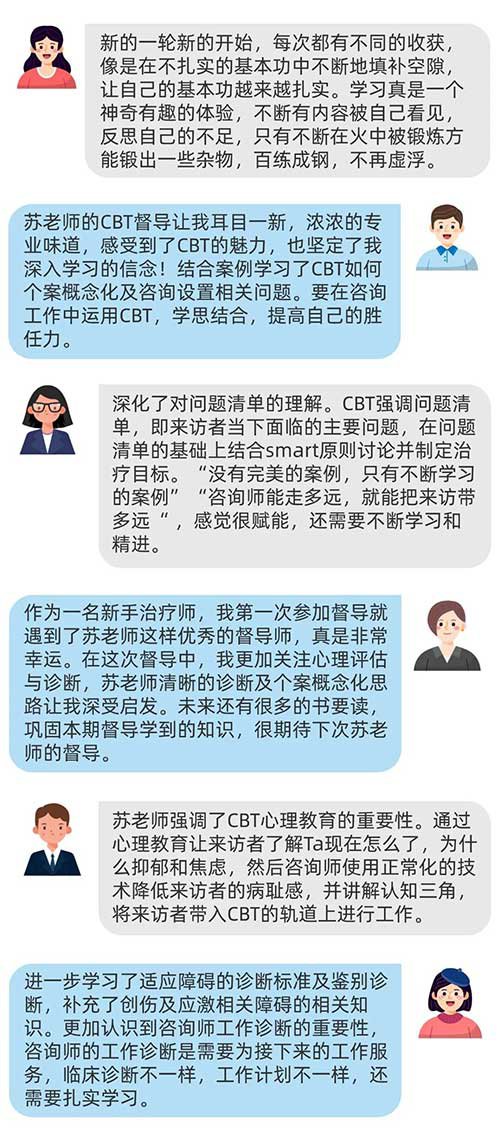苏老师通过认知行为治疗的结构化和个案概念化的理解及运用,帮助咨询师直面阻碍,深入理解来访者问题。她将引导咨询师调整工作方案策略,突破临床困境,从而为来访者提供更高效、更专业的心理咨询服务。